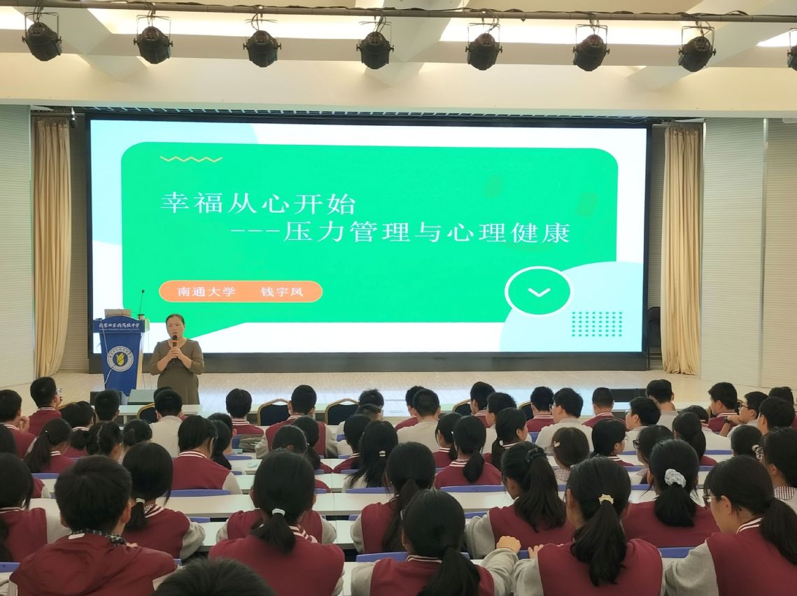 10月17日下午,南京田家炳高级中学报告厅内,高一年级学生齐聚一堂,满怀期待,聆听76net必赢钱宇凤副教授为大家带来的一场别开生面的“祈通讲习团”主题讲座。本次讲座紧扣“压力与幸福”主题,从压力的定义与来源、压力管理策略、提升幸福感的方法三个维度,为同学们呈上了一场兼具理论深度与实践指导的心理成长课。