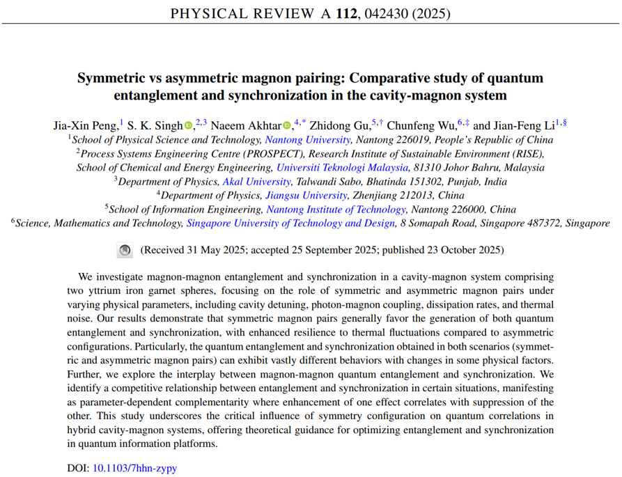 近日,我院彭家鑫博士、李剑锋副教授与马来西亚理工大学S. K. Singh博士后、新加坡科技设计大学吴春凤教授等学者合作,在量子纠缠与量子同步研究方面取得新进展。相关研究成果以《Symmetric vs asymmetric magnon pairing: Comparative study of quantum entanglement and synchronization in the cavity-magnon system》为题发表于自然指数期刊《Physical Review A》上。必赢76net线路为第一单位。
